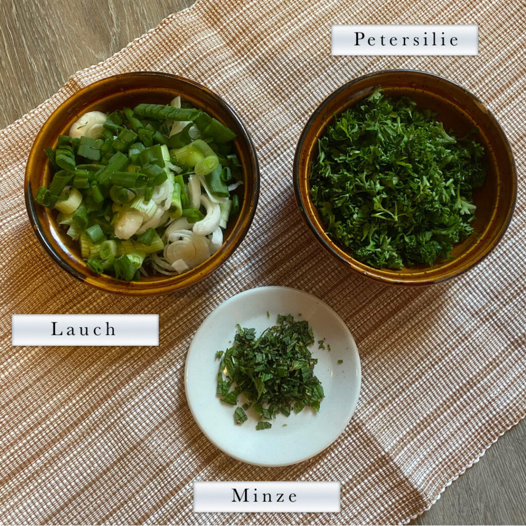 Die Puffer können sehr leicht mit Kindern zubereitet werden. Die Mengen an Kräutern und Knoblauch variieren nach dem eigenen Geschmack.