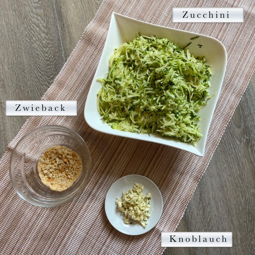 Die Zucchini werden gewaschen, grob geraspelt und gesalzen. Das Salz dient nicht nur zum Würzen, sondern entzieht den Zucchini das Wasser. Da diese sehr viel Wasser enthalten, müssen die Raspeln nach kurzer Ruhezeit noch vorsichtig ausgedrückt werden.